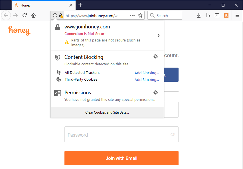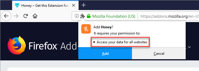 Because I wanted to reproduce these violations, I went ahead and installed the add-on into Firefox. As part of the installation process, I want to highlight the permissions Honey is requesting: