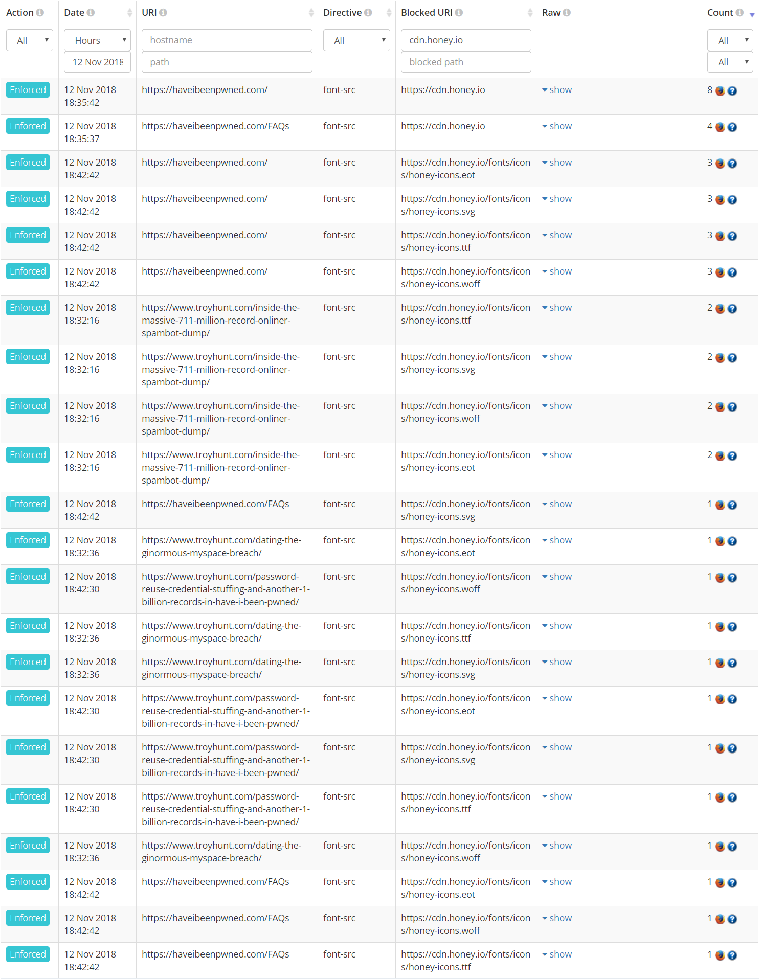 You know what I really like? A nice, slick, clean set of violation reports from the content security policy (CSP) I run on Have I Been Pwned (HIBP). You know what I really don't like? Logging on to Report URI and being greeted with something like this: