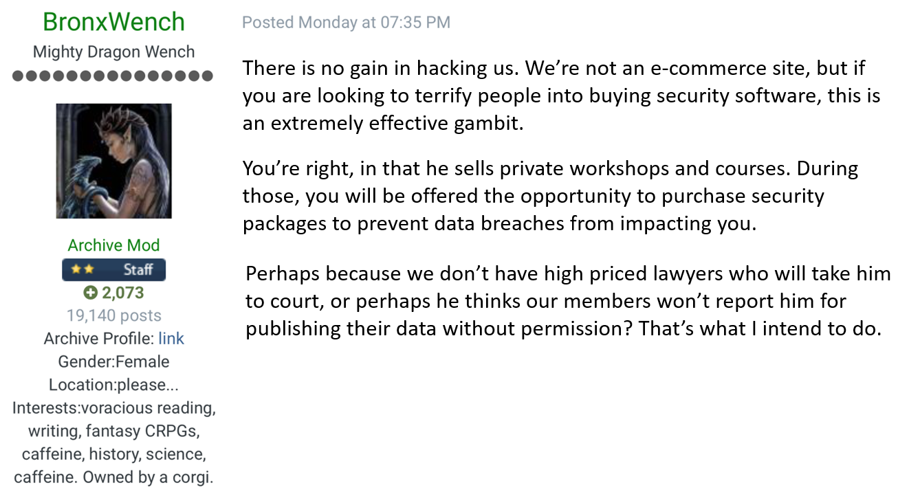On a (slightly) more serious note for a moment, this is what specifically pisses me off: I don't know how many disclosures I've done of both serious security vulnerabilities and complete breaches of data (100+, surely), but I have never, ever - not even once - asked for money. But Hammad isn't me: