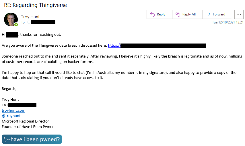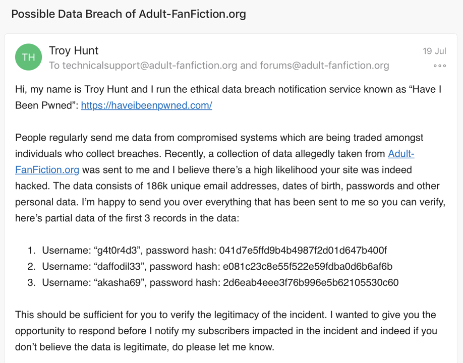 I always try to provide enough information to independently verify the incident thus making it easy to establish the legitimacy of my message. I'd done this so many times by then that I was very conscious of how scammy these messages can look. Alas, all reasonable measures were exhausted without response, I loaded the data into Have I Been Pwned (HIBP) and then they took notice: