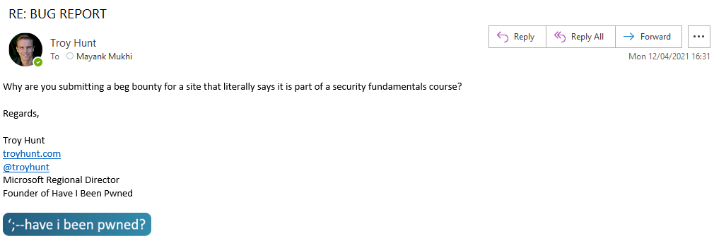 This is why my email above says "beg bounty" and it's exactly what it sounds like - someone begging for a bounty. Sophos wrote up a bunch of good examples earlier this year and they typically amount to easily discoverable configurations that are publicly observable and minor in nature. DMARC records. A missing CSP. Anything that as Sophos puts it, is "scaremongering for profit". And just to be crystal clear, these are "reports" submitted to website operators who do not have a published bug bounty. I love bug bounties (2 of my Pluralsight courses are on them with friend and Bugcrowd founder Casey Ellis), but we're not talking about organisations with the resources to invest in formal programs that pay money (which, incidentally, Pluralsight also runs). No, we're talking about resources like my blog and free community projects like HIBP. Hence the "beg" component of the bounty.