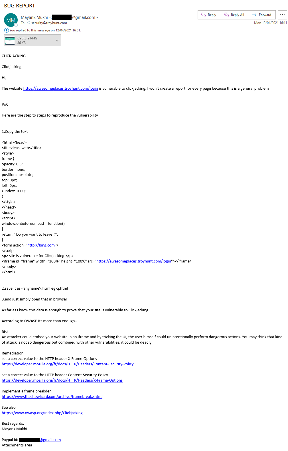 He's sent it to the email address I have published in my security.txt file which I put out there because I genuinely want to know if someone finds a security vulnerability in any of my things. And that's a real possibility; I've created dozens of courses on infosec (including one that includes a module on clickjacking!), I've written hundreds of blog posts on the topic, I've travelled the world running my Hack Yourself First workshop (over 100 times now), I've somehow even ended up in US Congress talking about cybersecurity! But I can make mistakes. Coding mistakes. Configuration mistakes. Or someone else makes one in a library or platform I'm dependent on and wammo! It is I who is pwned. But not this time: