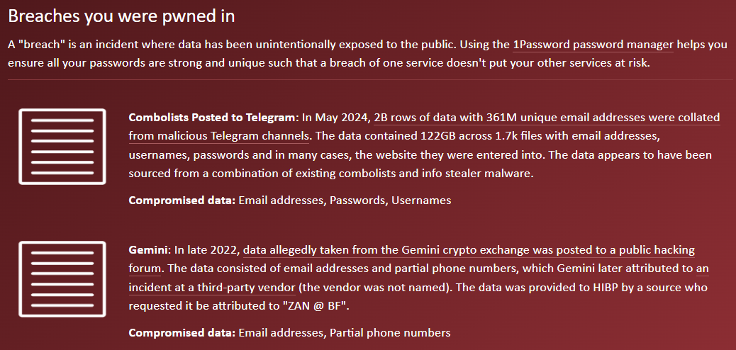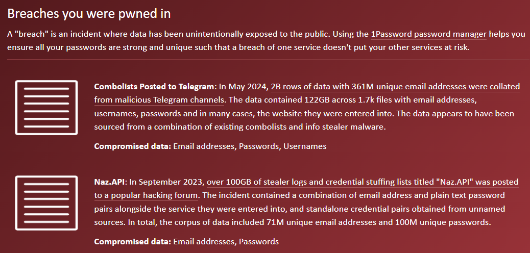 Two weeks ago, I was sent a further 22GB of stealer logs found in Telegram channels. Unlike the previous corpus of data, this set contained only stealer logs (no credential stuffing lists) and had a total of 26,105,473 unique email addresses. That's significant, as it implies that every single one of those addresses belongs to someone infected with malware that's stealing their creds. Of the total count, 89.7% had been seen in previous data breaches already in HIBP which is a high crossover, but it also meant that 2,679,550 addresses were all new. I'd been considering whether or not it made sense to load this data given corpuses such as this create frustration when people don't know which site their record was snared from nor which password was impacted. One particular frustration you'll read in comments on the previous post was that people weren't sure whether their email address was in a stealer log or a credential stuffing list; did they have a machine infected with malware or was it merely recycled credentials from an old data breach? But given the way in which this new corpus of data is being used (to attempt to scam Scott and, one would assume, many others), the 7-figure number of previously unseen addresses and the fact that this time, they can all emphatically be tied back to malware campaigns, this is now searchable in HIBP as "Stealer Logs Posted to Telegram".