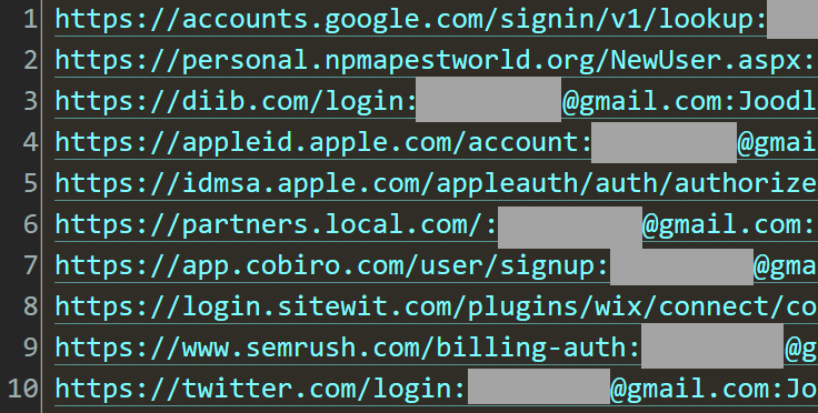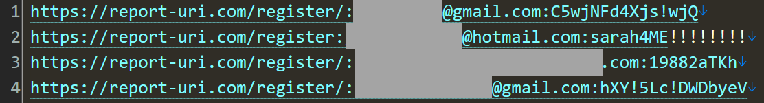 Most of the addresses we checked had appeared in the lists posted to Telegram I'd loaded into HIBP a couple of months ago. These were stealer logs, not a breach of Report URI! To validate that assertion, I pulled the original data source and parsed out every line containing "report-uri.com". Sure enough, the lines from the file sent to Scott were usually contained in the stealer log files. So, let's talk about how this works: