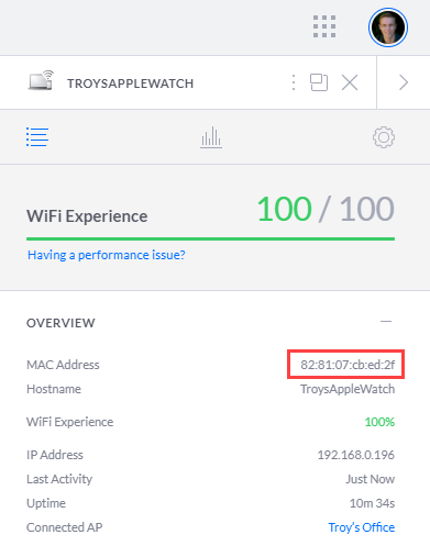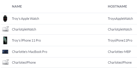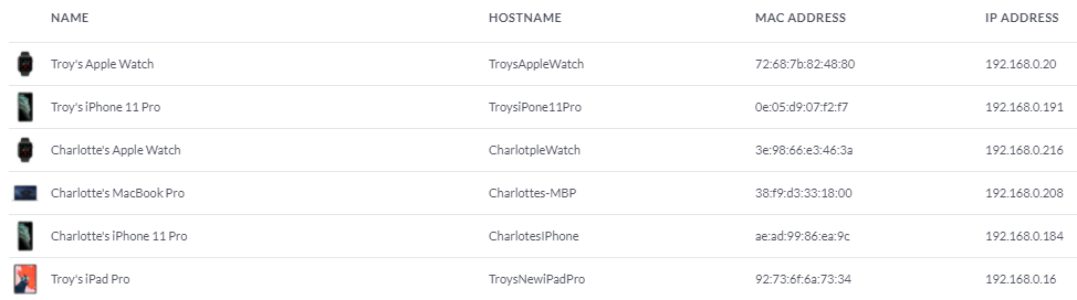 "TroysAppleWatch"?! Where's the apostrophe?! And the spaces?! And what's that hideous default icon doing there?! This wasn't the first time I'd seen this either; I'd noticed clients losing their settings for weeks now. I had a theory about what might be the cause so a week ago, I snapped a pic of a bunch of the Apple clients on my network, including their MAC addresses: