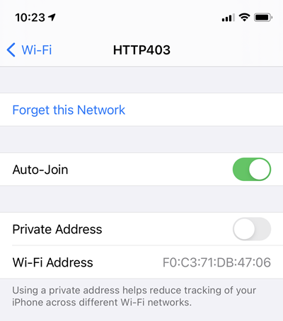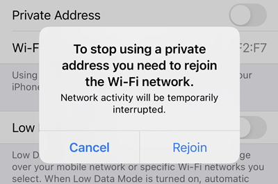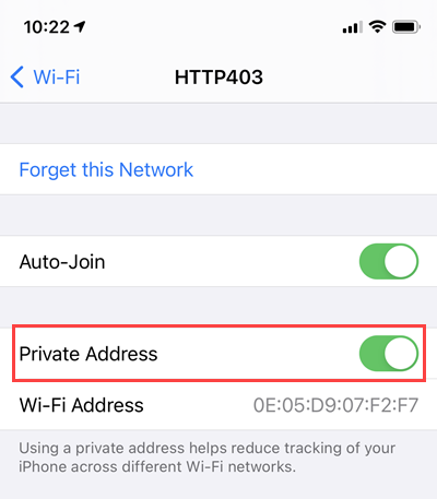 The fix is simply to jump into the Wi-Fi network and look for the "Private Address" toggle: