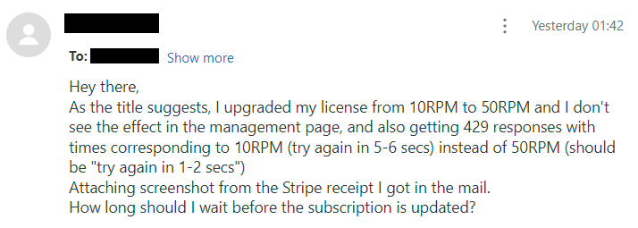 This came in via HIBP's API key support portal and is pretty self-explanatory. I checked the customer's account on Stripe and it did indeed show an active 50RPM subscription, but when drilling down into the associated payment, I found the following: