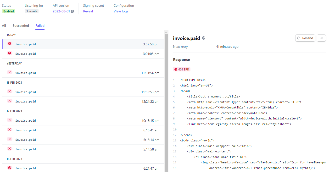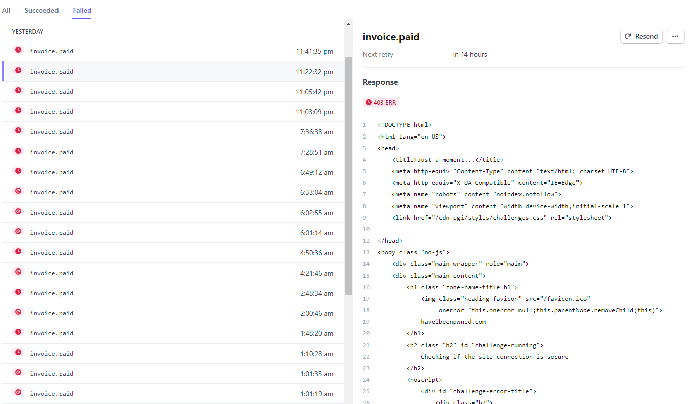 Ok, so at least I know where things have started to go wrong, but why? Over to the webhooks dashboard and into the failed payments and things look... suboptimal: