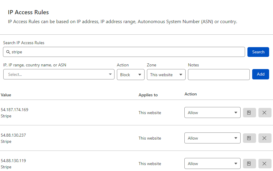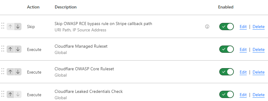 Desperate just to quickly restore functionality, I dropped into Cloudflare's WAF and allowed all Stripe's outbound IPs used for webhooks to bypass their security controls: