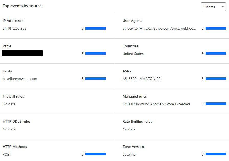 Except "they" could have been either Cloudflare or Stripe; if it wasn't me (and I was fairly certain it wasn't), was it a Cloudflare change to the rules or a Stripe change to a webhook payload that was now triggering an existing rule? Time to dig deeper again so it's over to the Cloudflare dashboard and down into the WAF events for requests to the webhook callback path: