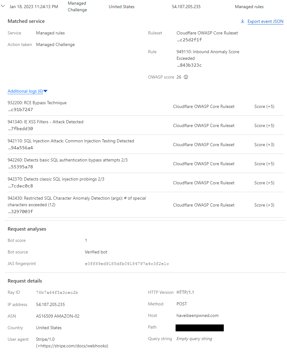 {"BotScore":1,"BotScoreSrc":"Verified Bot","CacheCacheStatus":"unknown","ClientASN":16509,"ClientCountry":"us","ClientIP":"54.187.205.235","ClientRequestHost":"haveibeenpwned.com","ClientRequestMethod":"POST","ClientRequestReferer":"","ClientRequestURI":"[redacted]","ClientRequestUserAgent":"Stripe/1.0 (+https://stripe.com/docs/webhooks)","EdgeRateLimitAction":"","EdgeResponseStatus":403,"EdgeStartTimestamp":1674073983931000000,"FirewallMatchesActions":["managedChallenge"],"FirewallMatchesRuleIDs":["6179ae15870a4bb7b2d480d4843b323c"],"FirewallMatchesSources":["firewallManaged"],"OriginResponseStatus":0,"WAFAction":"unknown","WorkerSubrequest":false}That's one of Stripe's outbound IP's on 54.187.205.235 and the "FirewallMatchesRuleIDs" collection has a value in it. Ergo, something about this request triggered the firewall and caused it to be challenged. I'm sure many of us have gone through the following thought process before: