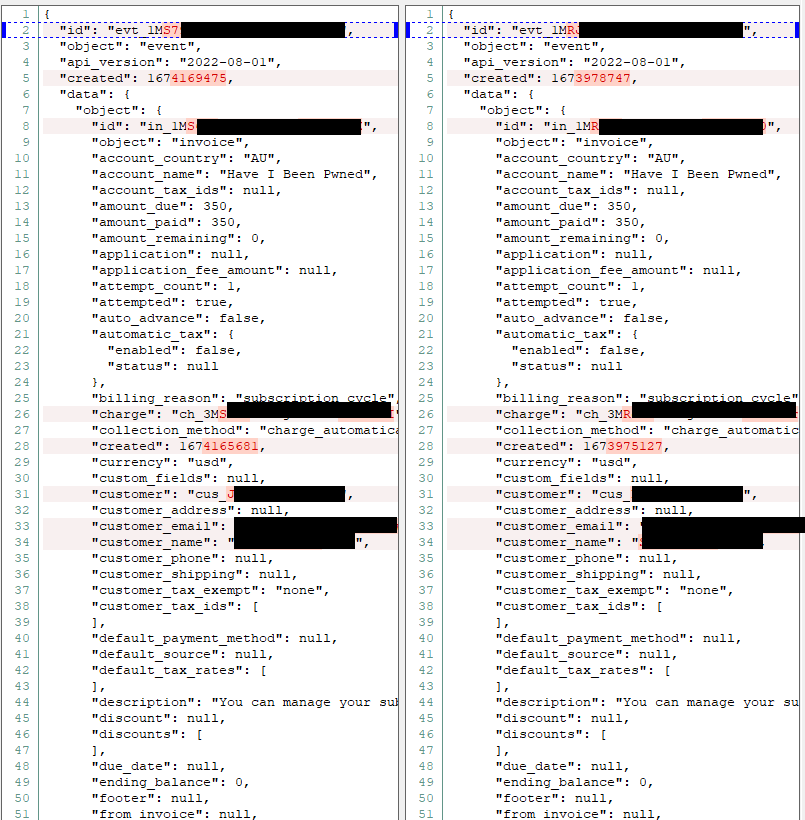 I wanted to compare the payload of a blocked request with a similar request that wasn't blocked, but they're only logged at Cloudflare when they trigger a rule. No problem, it's easy to grab the full request from Stripe's webhook history so I found one that passed and one that failed and diff'd them both:
