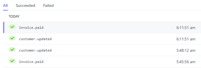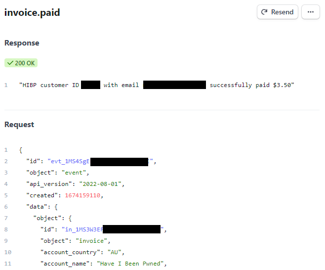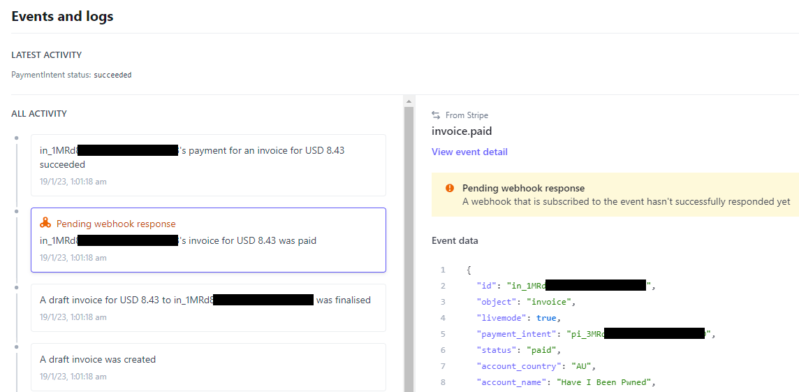 When you buy an API key on Have I Been Pwned (HIBP), Stripe handles all the payment magic. I love Stripe, it's such an awesome service that abstracts away so much pain and it's dead simple to integrate via their various APIs. It's also dead simple to configure Stripe to send notices back to your own service via webhooks. For example, when an invoice is paid or a customer is updated, Stripe sends information about that event to HIBP and then lists each call on the webhooks dashboard in their portal: