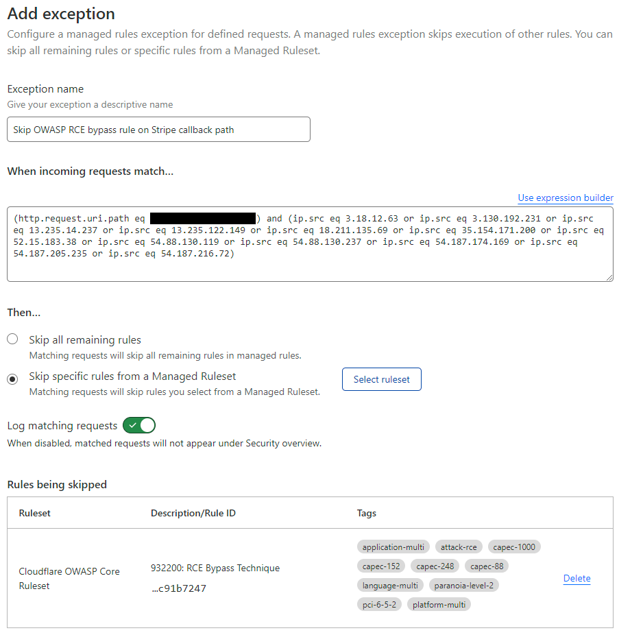 This meant I could create a simple exception that was much more intelligent than the previous "just let all outbound Stripe IPs in" by filtering down to the specific path those webhooks were flowing in to: