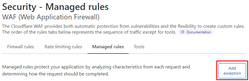 The joy of a managed firewall is that someone else takes all the rigmarole of looking after it away. I'm going to talk more about that in the summary shortly but clearly, that also creates risk as you're delegating control of traffic flow to someone else. Fortunately, Cloudflare gives you a load of configurability with their managed rules which makes it easy to add custom exceptions:
