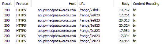 As you can see, the response sizes vary. What this means is that for an attacker sitting on the wire, even if every request was for the same hash prefix they'd have no idea which one it was as there's no observable consistency in the responses.