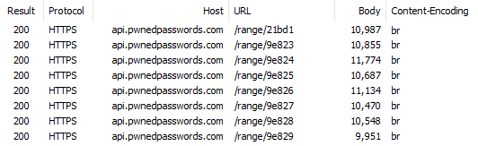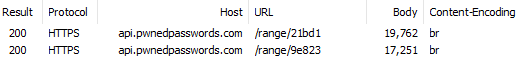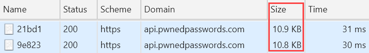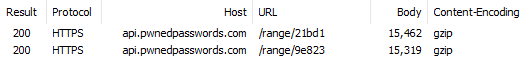 See that? The responses are different sizes. The first one has the aforementioned 528 rows whilst the new search has 523. Plus, passwords beginning with the first hash prefix have been seen a total of 59,087 times whilst the second one has a sum of 2,139. Different content, different response sizes.
