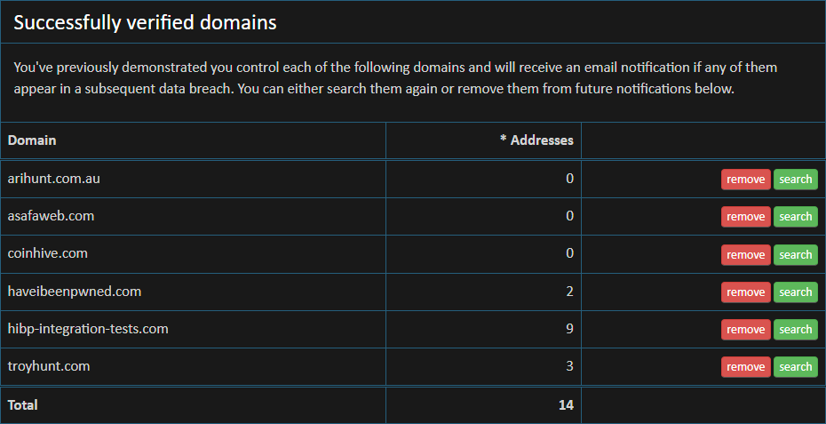 I originally introduced domain searches to HIBP only 6 weeks after the project first launched. Up until this week, it functioned exactly the same way for almost a decade: plug in a domain name, verify control of it then see the results. Each and every time. What it meant is that if you wanted to search a domain, you successfully demonstrated control then you came back later and tried to search it again, you had to go back through the same process: