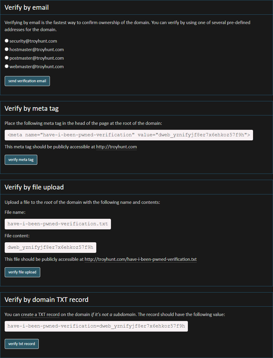 You'd be surprised at how many emails I get about the difficulty this poses. We don't have any of those 4 aliases on our domain. We can't add a meta tag. We can't upload a file. We can't touch DNS. It leaves me prone to asking "well do you really have control of the domain?" Thing is, "control" is a bit of a nuanced term; there are many people in roles where they don't have access to any of the above means of verification but they're legitimately responsible for infosec and responding to precisely the sorts of notifications HIBP sends out after a breach. Usually in these cases they can get support to go through the verification process, but it involves formal internal processes, ticketing, documentation and having to explain to some IT ops person why a data breach website with a funny name needs one of the above things to happen. This doesn't fix the pain of doing it once, but it does mean that it's now a one-off pain.