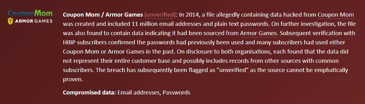 After a thorough investigation from an independent third party cyber security firm, it was confirmed that BeerAdvocate user login credentials (email address, BeerAdvocate forum password) were lost and aggregated along with breaches of other websites into a breach dataset that became known as CouponMom 2014.