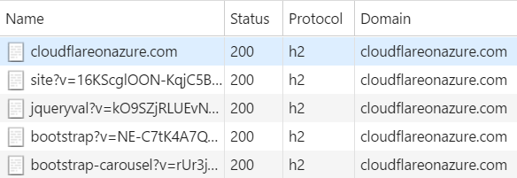 Here we have requests going to a domain hosted on Azure which can't talk HTTP/2 yet the protocol being returned is "h2" which is the identifier for HTTPS over HTTP/2. We see this because all requests are routed through CloudFlare which can talk h2. Now of course if CloudFlare needs to pull content from an origin that doesn't talk h2 then there'll still be a bottleneck in the connection, but many requests won't come from the origin anyway. Two thirds of the traffic on this blog is served directly from their cache so that can come down over h2 and make a significant difference to speeds even when the origin is stuck on HTTP/1.1.
