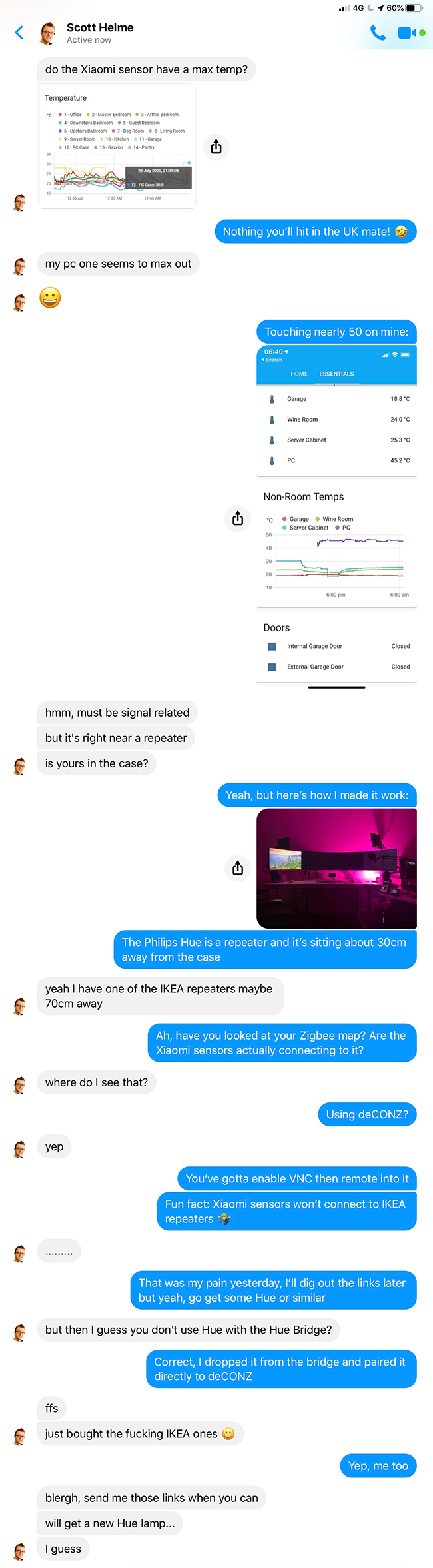 This creates a mesh network enabling you to expand the Zigbee range as more (mains powered) devices are added. That's all good in theory but in practice, well, let me just drop a discussion I had with my good mate Scott Helme in right here as he was going through his own HA build: