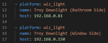For the most part, the IoT devices in my home simply take their IP address from the DHCP server and I never think about it again. There are, however, occasions where you end up getting tied to specific IP addresses. For example, here's how the downlights in my office are configured in HA courtesy of the Wiz integration: