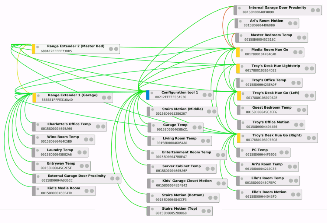 I wanted to include this discussion in its original candid state because it perfectly illustrates the frustrations I raised in part 1: this is still a "maker" world where even people who live and breathe tech day in and day out continue to hit hurdles. I found multiple references around the web about the IKEA repeaters not playing nice with Xiaomi devices, yet when I looked at my own Zigbee network, I saw this: