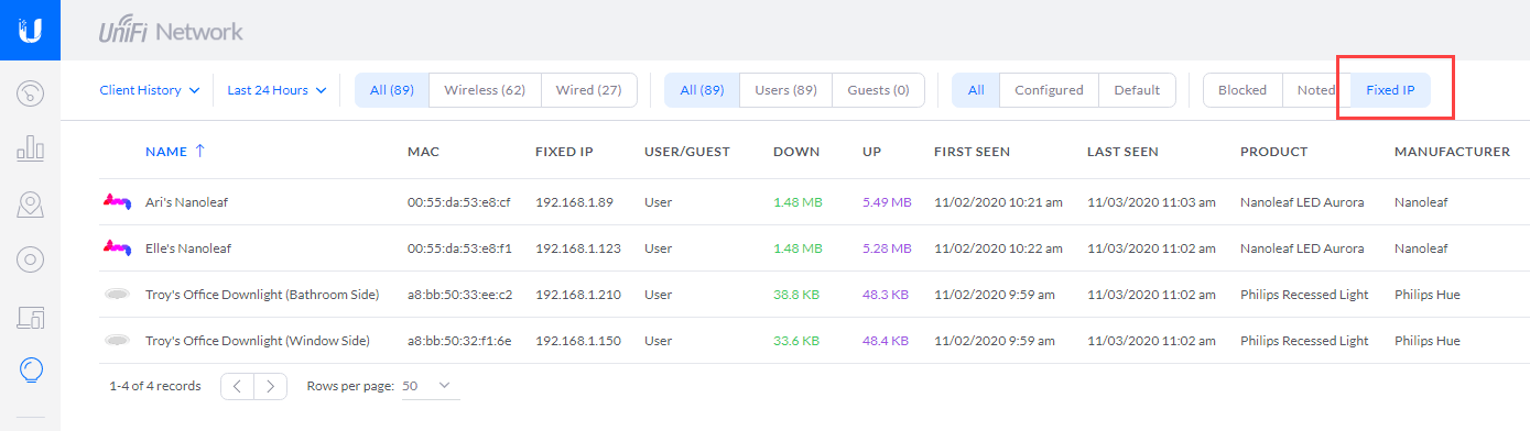 I got to thinking more about IP address reservation (which is what you see above where the same IP is always assigned by the DHCP server) versus static IP address (where the IP is set in the client itself), after having to totally rebuild my network. (If you're interested in what happened, I covered it in detail in weekly update video 216.) There's a good overview of the two approaches here but in a nutshell, central management is always preferable. It means it's very easy to jump into the UniFi dashboard and get a quick list of all the fixed IP addresses in the network (it's under "Insights"):