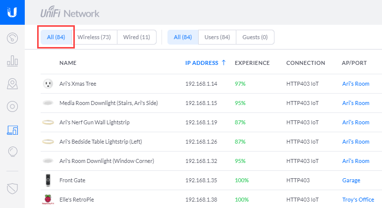 So, what happens when you start filling your home with IoT things? You end up assigning a lot of IP addresses; here's what it looks like in Ubiquiti's UniFi dashboard: