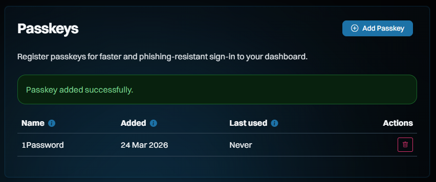 This saves you needing a "magic" link via email on every sign-in, and whilst it doesn't constitute 2FA (the passkey becomes a single factor used to sign in), it massively streamlines how you access the dashboard. And because we never used passwords for access in the first place, the only account-takeover risk our customers face is someone gaining access to either their email account or to where they store their passkeys (in either case, they have much bigger problems!).