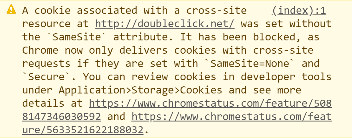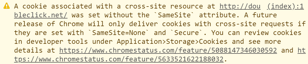 The "future release of Chrome" is version 80 and it's scheduled to land on the 4th of Feb which is rapidly approaching. Which brings us to the SameSite cookies mentioned in the console warning above. In a nutshell, they boil down to 3 different ways of handling cookies based on the value set: