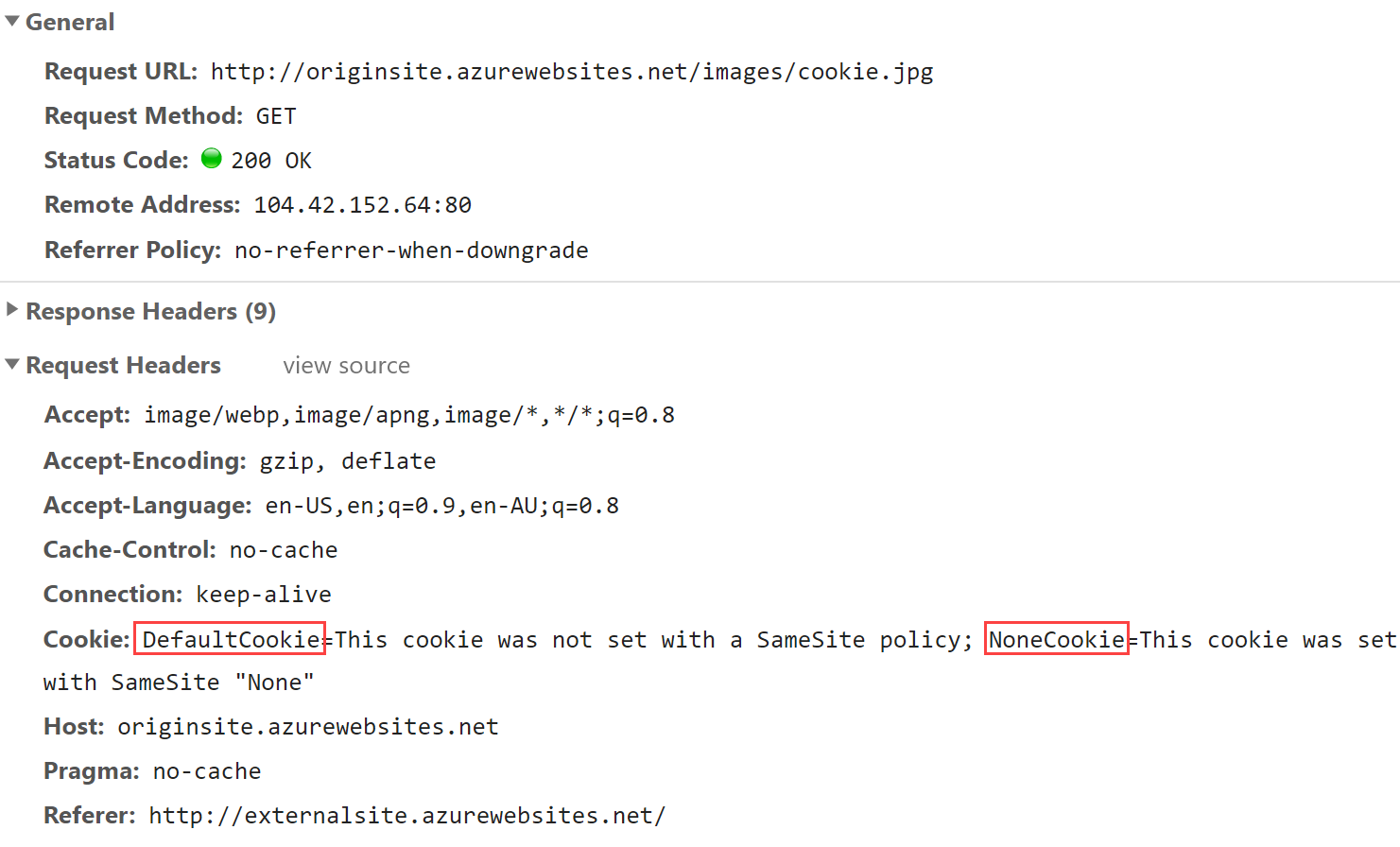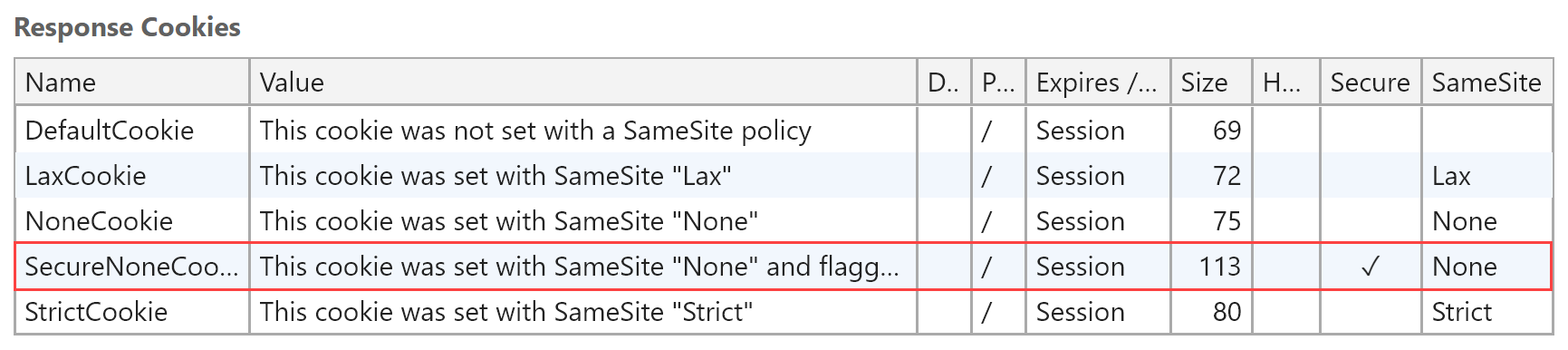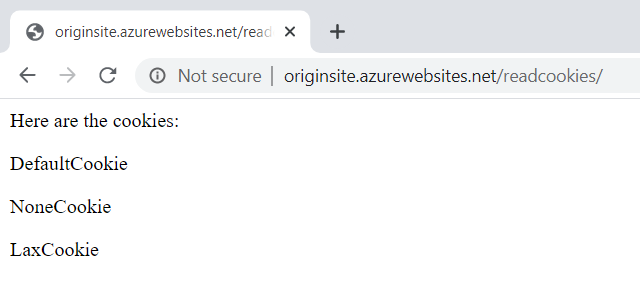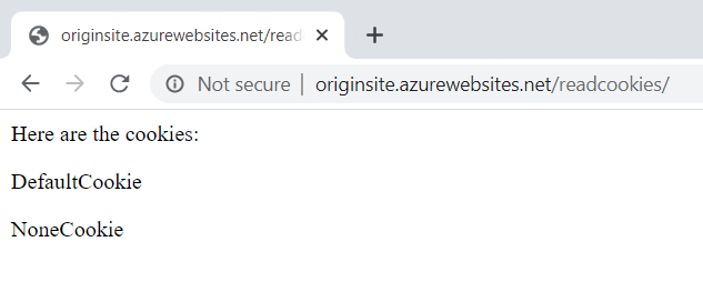 As a massive HTTPS proponent, this makes me happy ? To demonstrate this behaviour, I've added an additional "None" cookie but flagged it as secure. As such, the cookie will only stick after being loaded over an HTTPS connection so give this a go: https://originsite.azurewebsites.net/setcookies/
