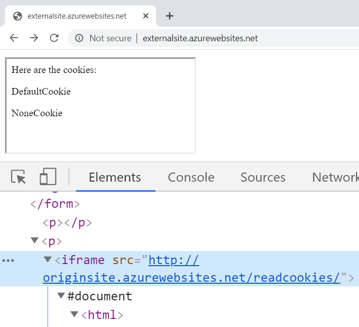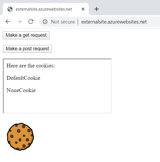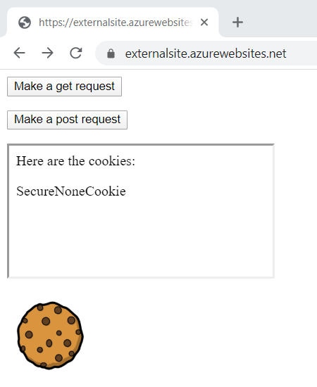 I'm showing the Chrome dev tools here as they make it easy to see the SameSite value that's been set for each cookie (if set at all). These have been given self-explanatory names so no need to delve into them here. The main thing is that the site setting the cookies can read them all. But that's not what SameSite is all about, let's make it interesting and load up http://externalsite.azurewebsites.net/