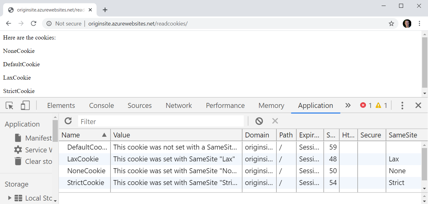 Come version 80, any cookie without a SameSite attribute will be treated as "Lax" by Chrome. This is really important to understand because put simply, it'll very likely break a bunch of stuff. In order to demonstrate that, I've set up a little demo site to show how "Lax" and "Strict" SameSite cookies behave alongside the traditional ones with no policy at all. I'm going to do this with an "origin" site (the one that sets the cookies in the first place) and an "external" site (one which links to or embeds content from the origin site). Let's begin by visiting the origin site at http://originsite.azurewebsites.net/setcookies/