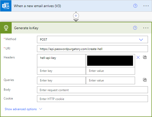 Using the built in connector to my Microsoft 365 email account, the presence of a new email in that folder triggers a brand new instance of a flow. Following, I've added the "HTTP" connector which enables me to make an outbound request: