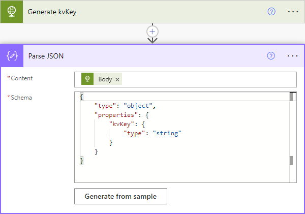 There's no value yet, just a key and it's returned via a JSON response in a property called "kvKey". To read that back in the flow, I need a "Parse JSON" step with a schema I generated from a sample: