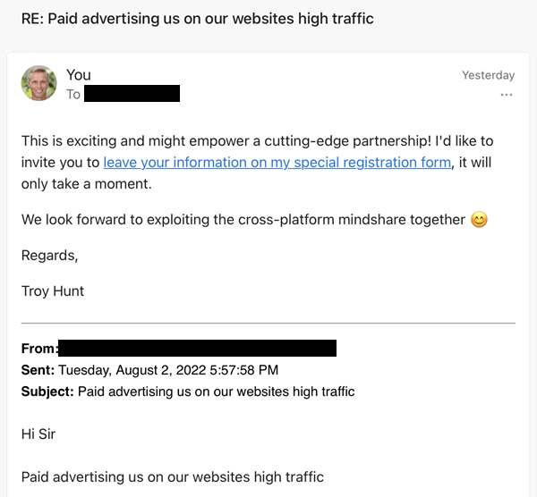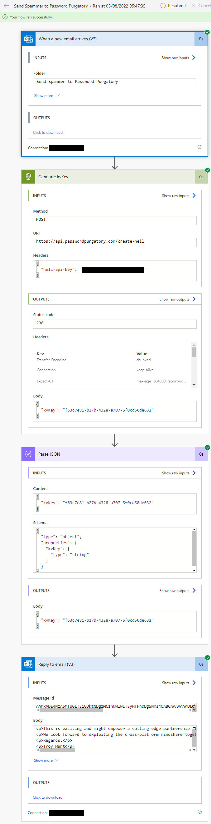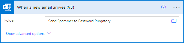 Microsoft Power Automate (previously "Microsoft Flow") is a really neat way of triggering a series of actions based on an event, and there's a whole lot of connectors built in to make life super easy. Easy on us as the devs, that is, less easy on the spammers because here's what happens as soon as I file an email in the aforementioned folder: