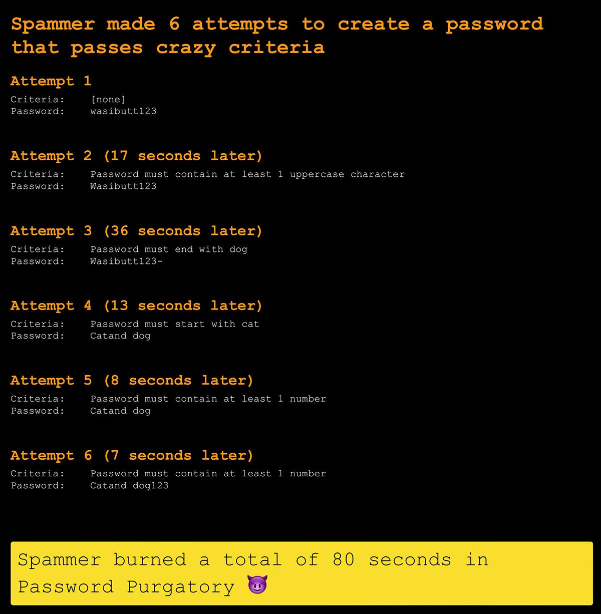 Ah, satisfaction 😊 I listed the amount of time the spammer burned with a goal to further refining the complexity criteria in the future to attempt to keep them "hooked" for longer. Is the requirement for a US post code in the password a bit too geographically specific, for example? Time will tell and I wholeheartedly welcome PRs to that effect in the original Password Purgatory API repo.