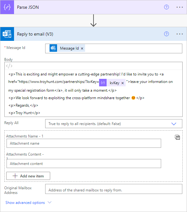 Because it would be rude not to respond, I'd like to send the spammer back an email and invite them to my very special registration form. To do this, I've grabbed the "Reply to email" connector and fed the kvKey through to a hyperlink: