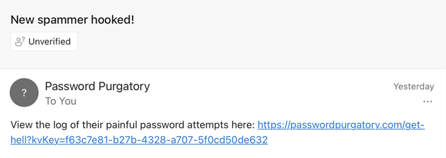 How best to punish spammers? I give this topic a lot of thought because I spend a lot of time sifting through the endless rubbish they send me. And that's when it dawned on me: the punishment should fit the crime - robbing me of my time - which means that I, in turn, need to rob them of their time. With the smallest possible overhead on my time, of course. So, earlier this year I created Password Purgatory with the singular goal of putting spammers through the hellscape that is attempting to satisfy really nasty password complexity criteria. And I mean really nasty criteria, like much worse than you've ever seen before. I opened-sourced it, took a bunch of PRs, built out the API to present increasingly inane password complexity criteria then left it at that. Until now because finally, it's live, working and devilishly beautiful 😈