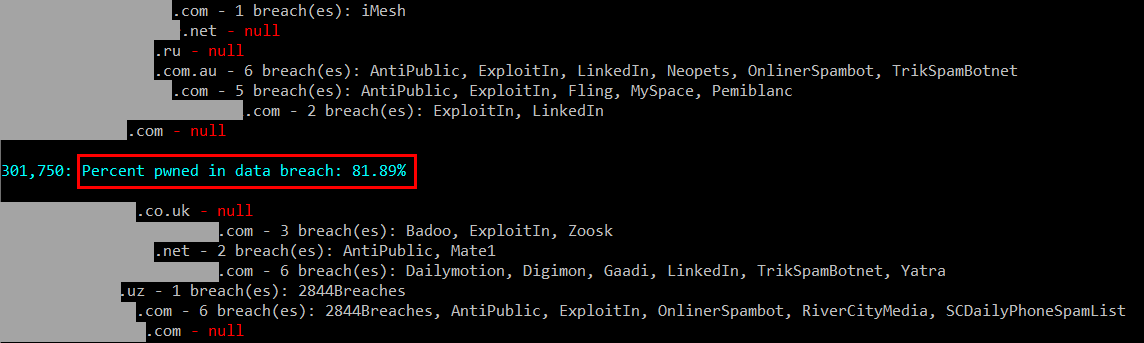 The unique email addresses totalled 772,904,991. This is the headline you're seeing as this is the volume of data that has now been loaded into Have I Been Pwned (HIBP). It's after as much clean-up as I could reasonably do and per the previous paragraph, the source data was presented in a variety of different formats and levels of "cleanliness". This number makes it the single largest breach ever to be loaded into HIBP.