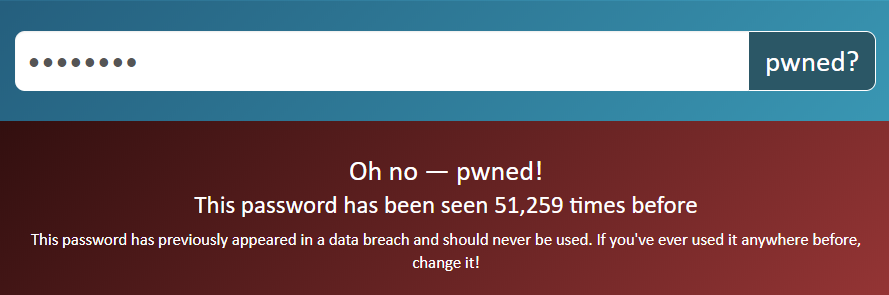 Obviously, any password that's been seen over 51k times is terrible and you'd be ill-advised to use it anywhere. When I searched for that password, the data was anonymised first and HIBP never received the actual value of it. Yes, I'm still conscious of the messaging when suggesting to people that they enter their password on another site but in the broader scheme of things, if someone is actually using the same one all over the place (as the vast majority of people still do), then the wakeup call this provides is worth it.