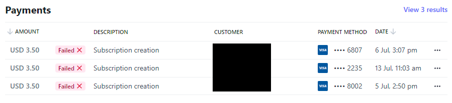 For a variety of reasons, I believe the guy is legit, but Stripe reports two payments declined by his bank and another due to an invalid CVC. But using Stripe doesn't just mean credit cards, it also means Apple Pay and Google Pay, WeChat Pay in China, EPS in Belgium, Afterpay in Australia and a raft of other payment mechanisms in different parts of the world. It's hard to imagine a legitimate case where someone does not have access to any of the available payment mechanisms, which brings me to the second part: