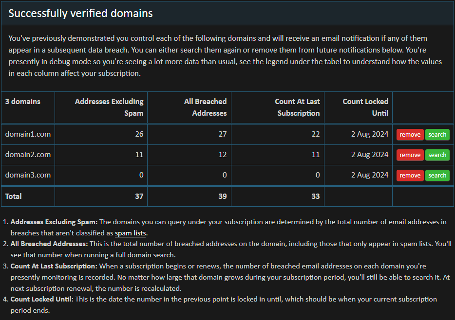 I'm conscious that this concept can get confusing: domain searches are based on the number of breached accounts on the domain but not including spam lists and then locked in at the size of the domain until the next subscription renew... phew! The debug mode link mentioned above aims to show all this logic in its raw detail: