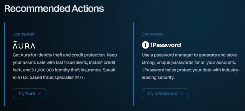 Which brings me to identity protection and, more specifically, Aura. I've known the folks there for years, and they were a sponsor of this blog for half a dozen weeks back in 2023. Their remit is to protect people from precisely the sort of outcomes my friend above suffered. They pride themselves on responding to fraud events super fast, providing 24/7 US-based customer support (that alone makes a massive difference), and even providing $1M American dollars in identity theft insurance. The US emphasis there is because, like Truyu who we recently onboarded to help Aussies, Aura is a geo-specific service and in this case, is there to help our friends in the US. As such, if you're coming to HIBP from that part of the world you'll see them appear in your dashboard and on the breach-specific pages: