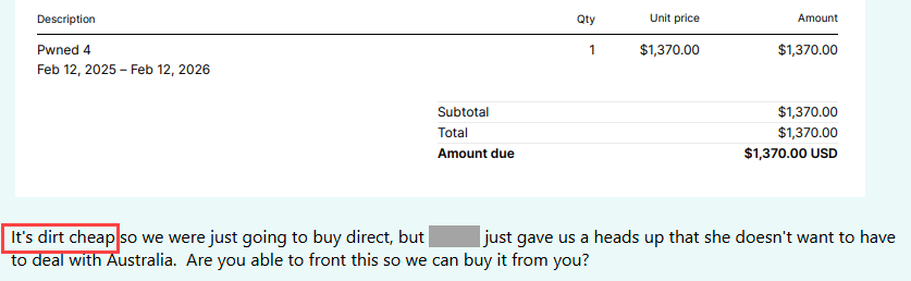 I'll leave you with a bit of levity related to subscription costs and value. As I recently lamented, resellers can be a nightmare to deal with, and we're seriously considering banning them altogether. But occasionally, they inadvertently share more than they should, and we get an insight into how the outside world views the service. Like a recent case where a reseller accidentally sent us the invoice they'd intended to send the customer who wanted to purchase from us, complete with a 131% price markup 😲 It was an annual Pwned 4 subscription that's meant to be $1,370, and simply to buy this on that customer's behalf and then hand them over to us, the reseller was charging $3,165. They can do this because we make the service dirt cheap. How do we know it's dirt cheap? Because another reseller inadvertently sent us this internal communication today: